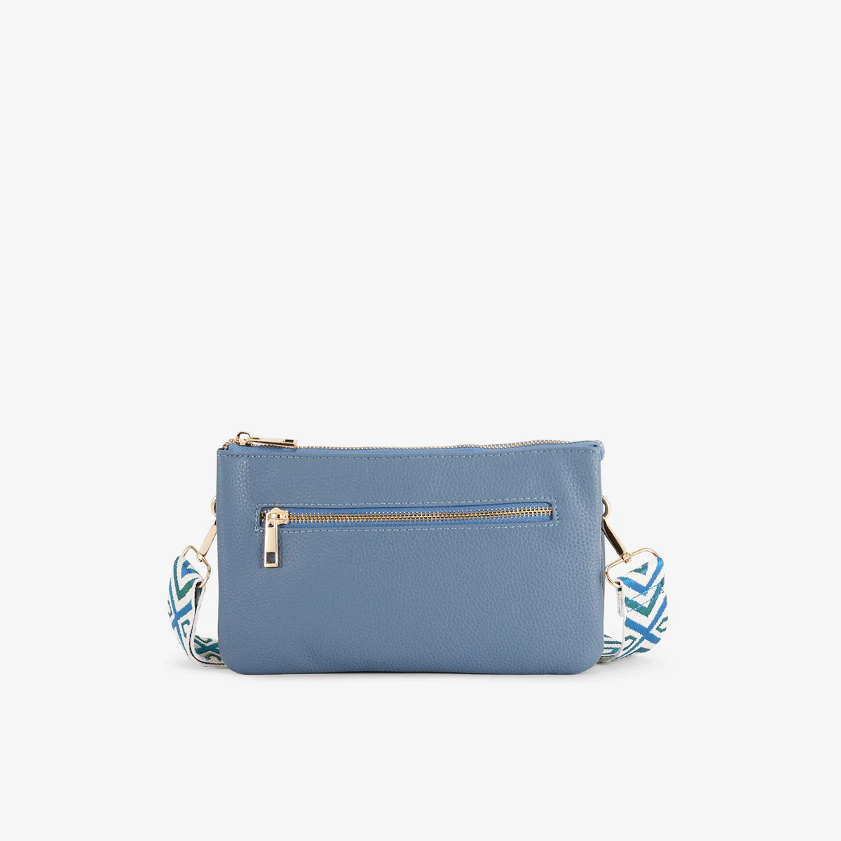 Pochette bleue multi‑poches avec bandoulière motif géométrique